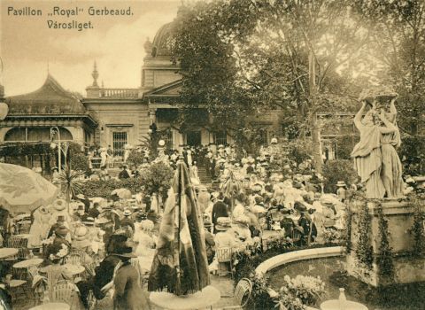 Jómódú társaság a városligeti Gerbeaud Royal Pavilonban (1910 körül)