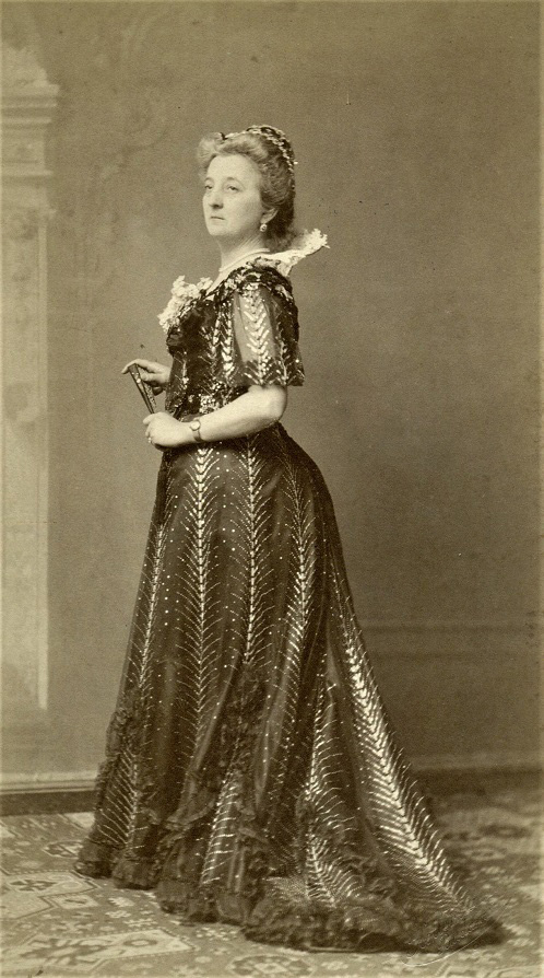 Ramseyer Eszter alkalmi öltözetben, ékszerekkel, órával, legyezővel (1901)