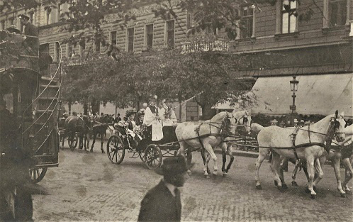 Salgó Sándor fotográfus képe a Cukrász Dalkör zászlószentelési ünnepségéről. A hintóban Gerbeaud Emilné